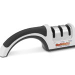 Chef’s Choice Pronto Pro is a hand held little knife sharpener, about 10 inches long with 3 grooves. You pull the knife through the grooves and it sharpens and keeps the knife at the right angle. SRP $49.99